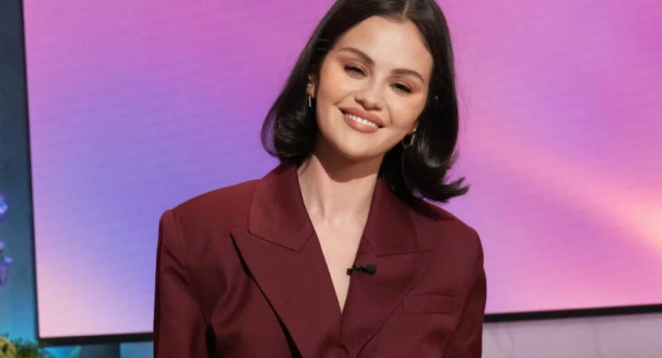 Η ηθοποιός επιλέγει το μπορντό που κυριαρχεί φέτος το φθινόπωρο σε μια κομψή εμφάνιση με cropped blazer και loose παντελόνι.