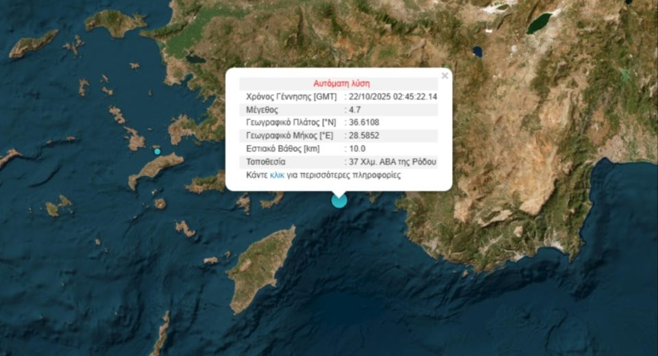 Έντονη σεισμική δόνηση σημειώθηκε κοντά στη Ρόδο, με το επίκεντρο να βρίσκεται 37 χιλιόμετρα μακριά από την πόλη.