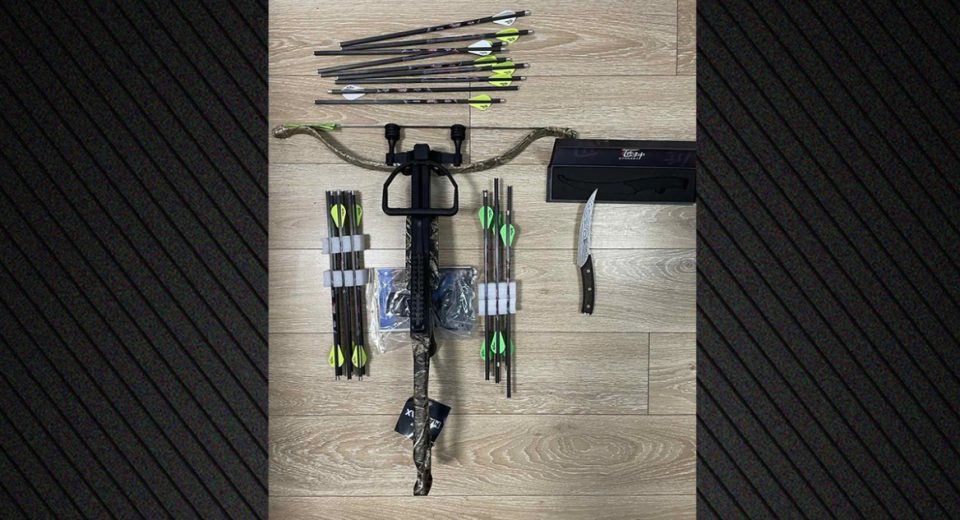 Κατά τον έλεγχο εξόδου από τη χώρα, εντοπίστηκαν και κατασχέθηκαν μία βαλλίστρα με 21 βέλη και ένα μαχαίρι που κρατούσε ο αλλοδαπός.