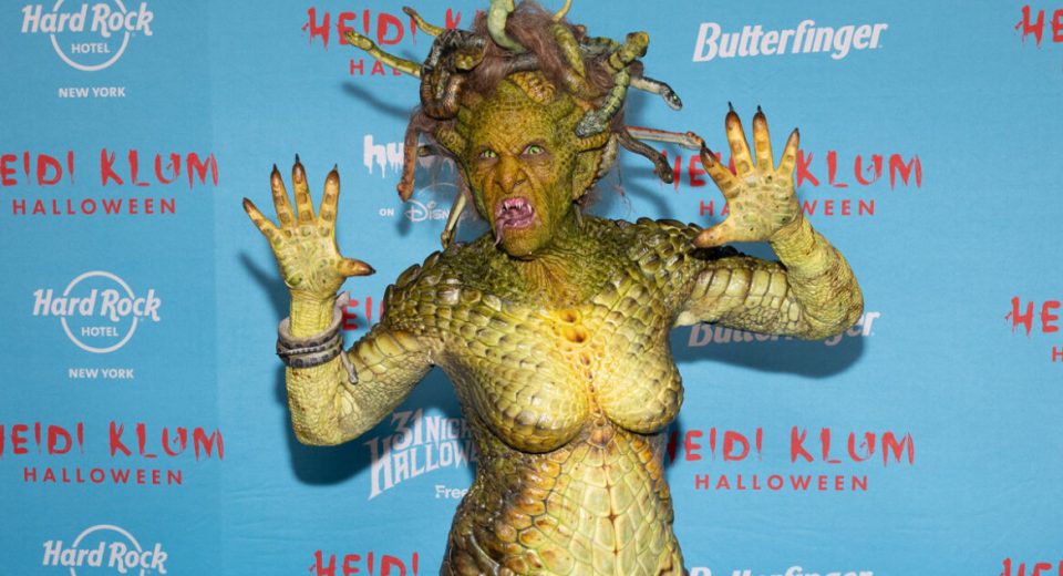 Το διάσημο μοντέλο επέλεξε τη μυθική μορφή της Μέδουσας για τη μεταμφίεσή της, ενώ ο σύζυγός της ενσάρκωσε στρατιώτη που μετατράπηκε σε πέτρα.